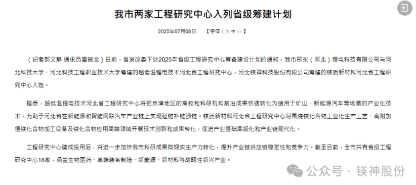 2025年7月8日,河北省發(fā)展和改革委員會正式公布了新一批河北省工程研究中心籌建計(jì)劃入選名單。由河北鎂神科技有限公司(簡稱:鎂神科技)牽頭籌建的“鎂質(zhì)新材料河北省工程研究中心”經(jīng)過嚴(yán)格遴選和專家評審,成功獲批立項(xiàng),正式列入省級工程研究中心籌建計(jì)劃名單!這是鎂神科技發(fā)展歷程上的又一重要里程碑,也是河北省對我公司在鎂質(zhì)新材料領(lǐng)域創(chuàng)新能力與發(fā)展?jié)摿Φ母叨日J(rèn)可!