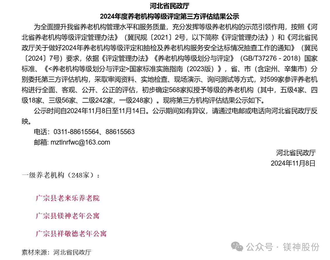 近日,河北鎂神科技股份有限公司旗下的廣宗縣鎂神老年公寓通過(guò)養(yǎng)老機(jī)構(gòu)等級(jí)評(píng)定,獲河北省一級(jí)養(yǎng)老機(jī)構(gòu)。